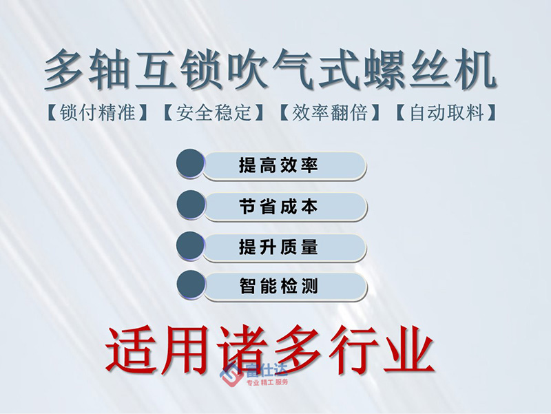 轉(zhuǎn)臺式自動鎖螺絲機(jī)主要由多軸鎖付系統(tǒng)、自動送釘系統(tǒng)、同步作業(yè)臺、PLC控制系統(tǒng)等組成,設(shè)備根據(jù)產(chǎn)品生產(chǎn)要求定制送釘系統(tǒng)及鎖付系統(tǒng),可實(shí)現(xiàn)一次輸送并擰好多顆螺絲的效果,通過設(shè)計(jì)同步作業(yè)臺,增強(qiáng)人機(jī)互動,多工序同步進(jìn)行,提升效率。日常操作中,作業(yè)員僅需不停取放產(chǎn)品即可,設(shè)備自動輸送螺絲、自動擰好所有螺絲。
